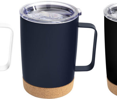 Diseño elegante con base de corcho. Mug doble pared con asa, sellado al vacío. Mug con aislamiento térmico. Tecnología vacuum.