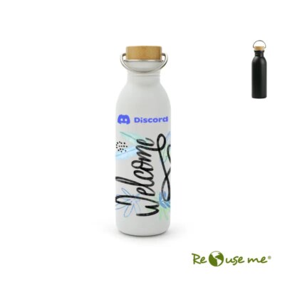 Botella de metal con tapa de bamboo. Cuenta con una manija de agarre sobre su tapa para fácil transporte y