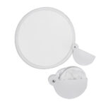 Abanico plegable de poliéster. Se guarda plegado en base semi-circular de plástico ABS. Simple, económico y fácil de imprimir o sublimar, ideal para promociones de verano.
