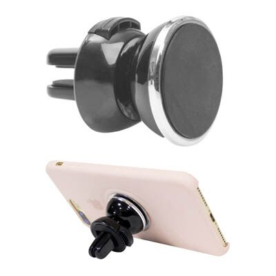 Ø 3 x 5 cm. Soporte magnético para celular. El adaptador se puede incorporar a la rejilla del aire acondicionado del auto y se adapta a cualquier tamaño. El agarre del celular es por medio de imán, sólo se debe colocar una placa de metal en el celular. En la placa de metal es donde se aplica el logo.