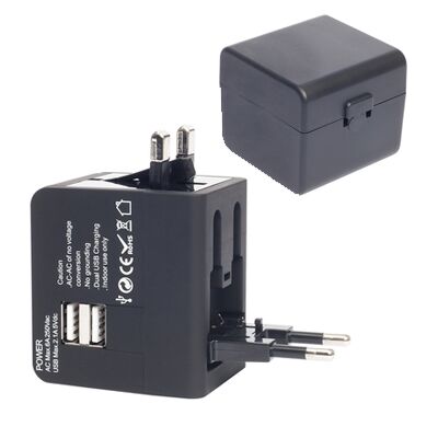 6 x 4,6 cm. Plástico engomado. Adaptador de enchufe universal. Dos entradas USB para utilizarlo como cargador, boton push que al presionar saca tres adaptadores UK, USA/ASUT y europeo. Luces indicadoras de encendido. Con caja plástica
