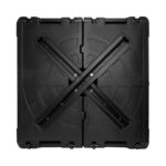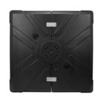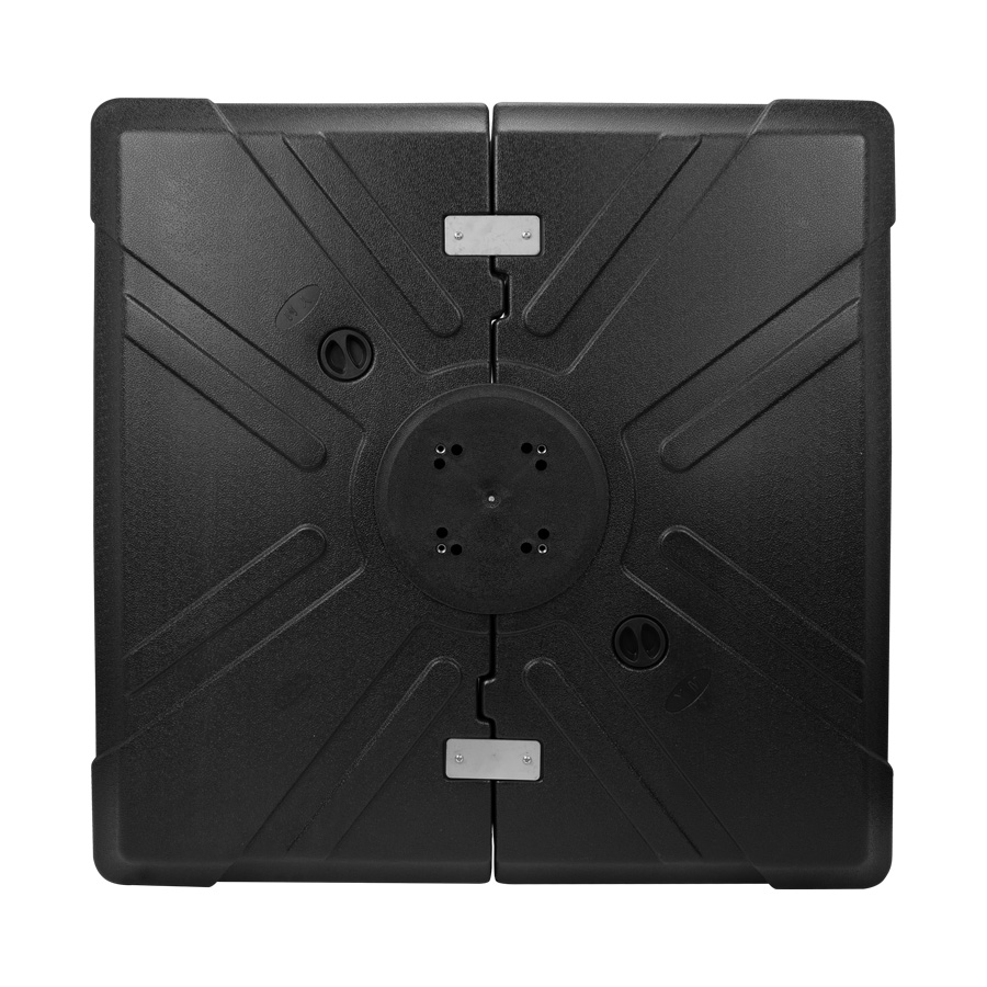 Base cuadrada de plástico HDPE rígido, rellenable (con arena o piedrecillas, para darle mayor peso), con una capacidad total de 180kg. Incluye 2 ruedas, para fácil traslado y movimiento del quitasol.