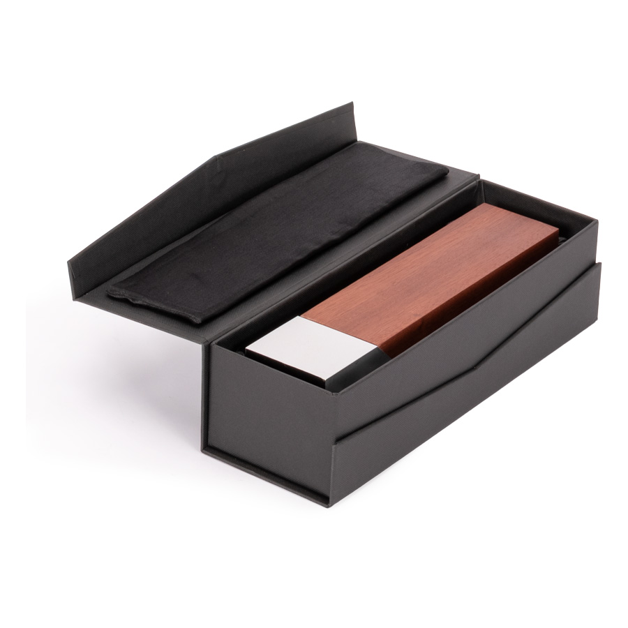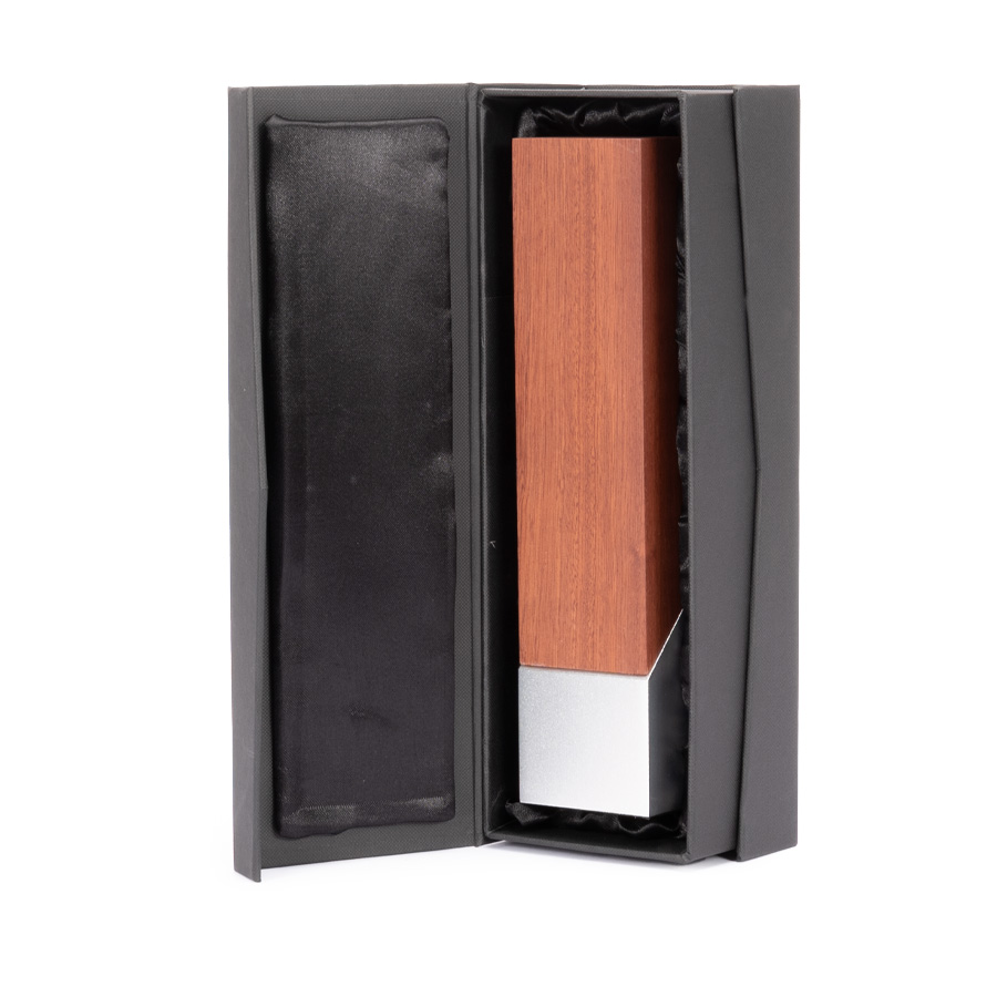 Elegante Trofeo de Madera barnizada con base de acero plateado, modelo “LUKAS”, con forma de bloque. Presentación en caja de cartón forrado negro con cierre imantado, interior acolchado de espuma y tela poliéster satinado negro, con troquel.