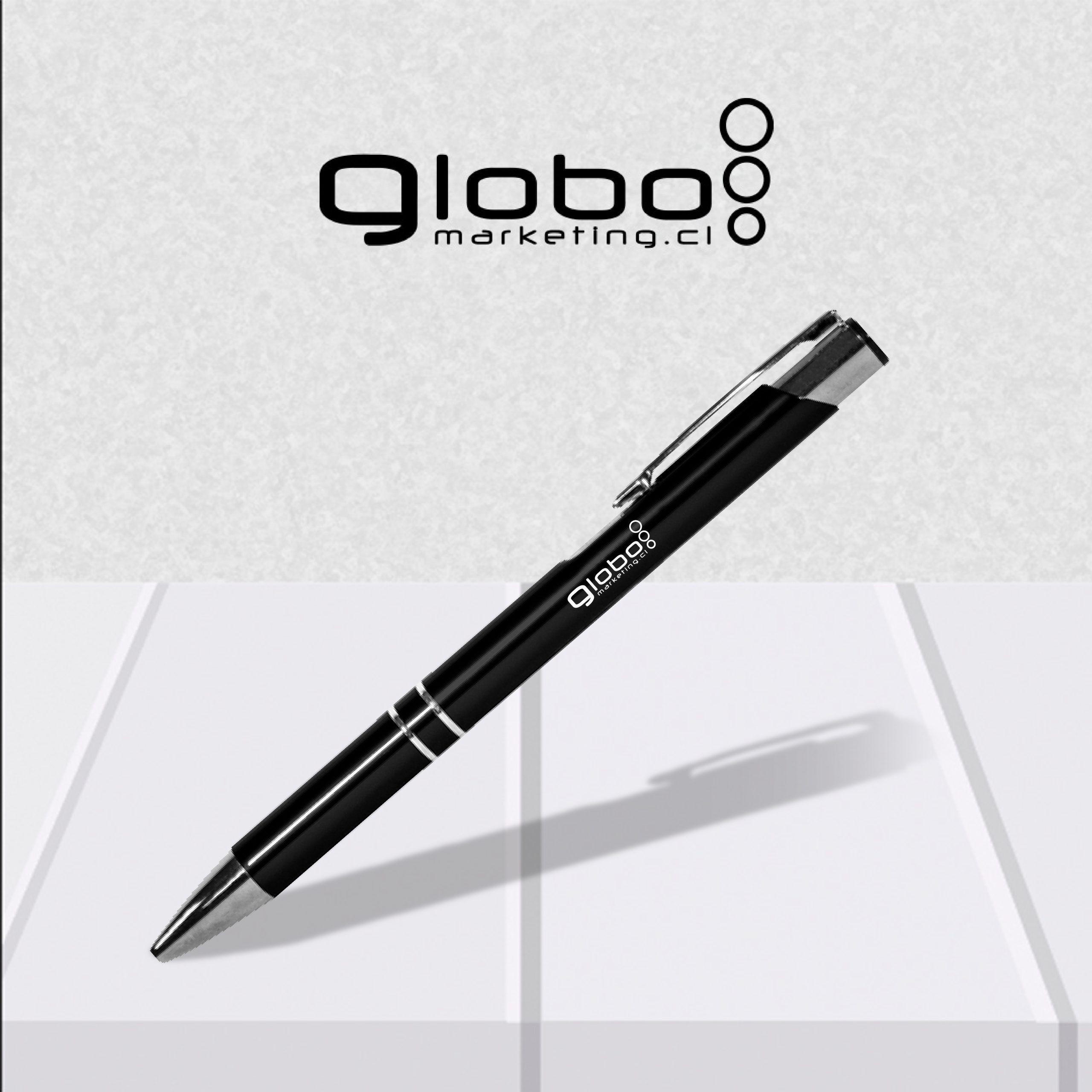Aluminio. Cuerpo metálico de color. Clip, punta, y pulsador color plata. En el centro del bolígrafo cuenta con dos arandelas y más arriba finalizando el clip cuenta con una muesca color plata. Tinta negra
