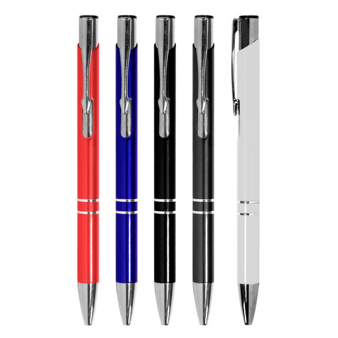 Aluminio. Cuerpo metálico de color. Clip, punta, y pulsador color plata. En el centro del bolígrafo cuenta con dos arandelas y más arriba finalizando el clip cuenta con una muesca color plata. Tinta negra