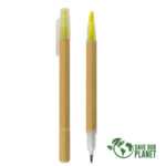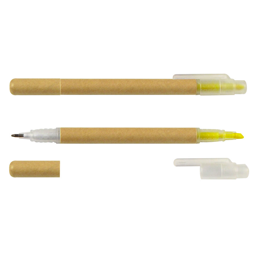Bolígrafo Ecológico de Cartón Reciclado con terminales de plástico PET biodegradable traslúcido. Con Destacador Amarillo en la otra punta. Escritura Azul.