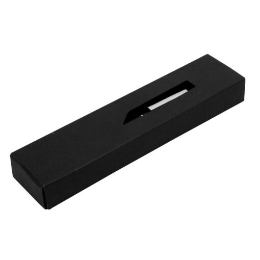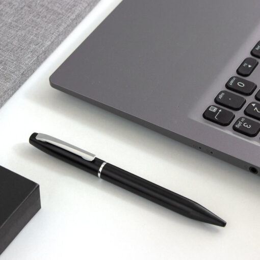 Bolígrafo con apertura giratoria. Cuerpo metálico en negro mate. Cuerpo de aluminio reciclado. Destape electroplateado en la parte superior. Recarga metálica. Clip y anillos metálicos color plata.