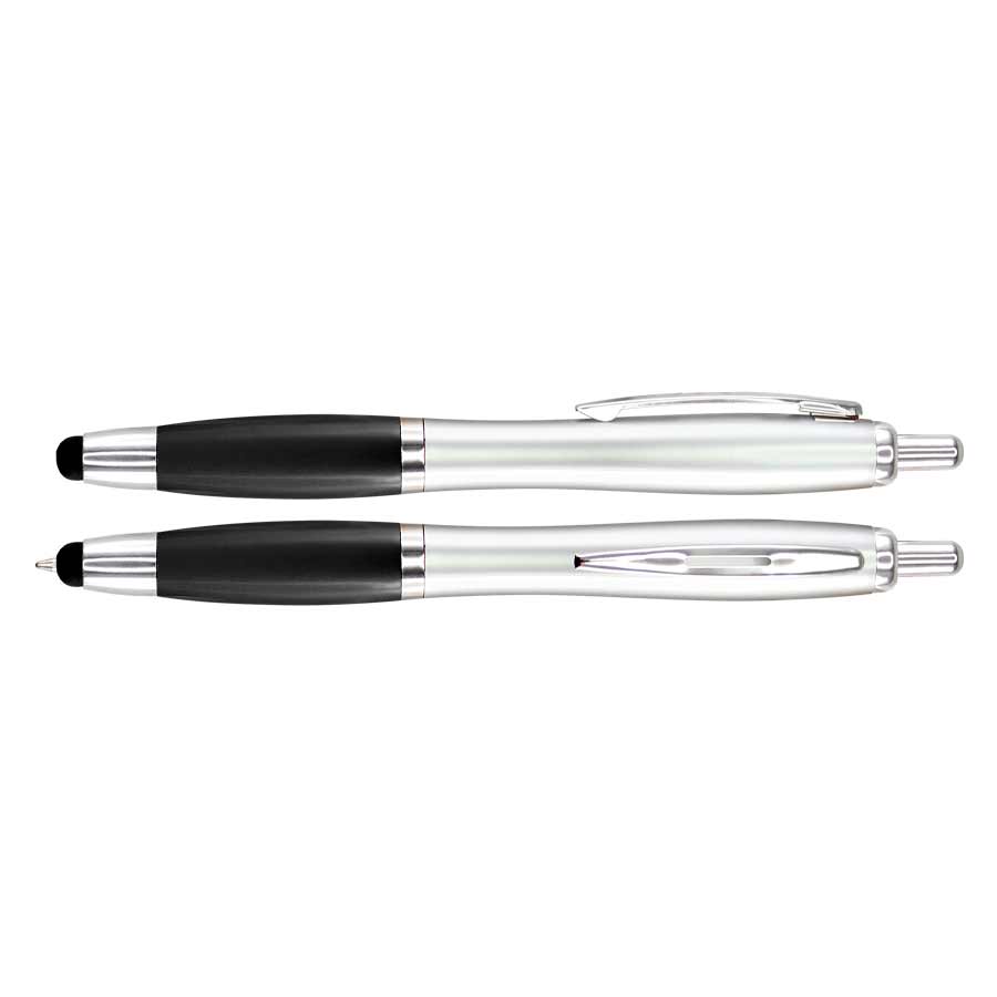 Bolígrafo plateado “New Satin Touch-Screen” con goma negra para pantalla táctil. Escritura azul.