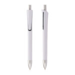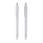 Bolígrafo plástico con cuerpo blanco mate, terminales plateados y detalle bajo el clip de color. Escritura azul.