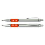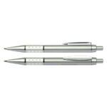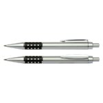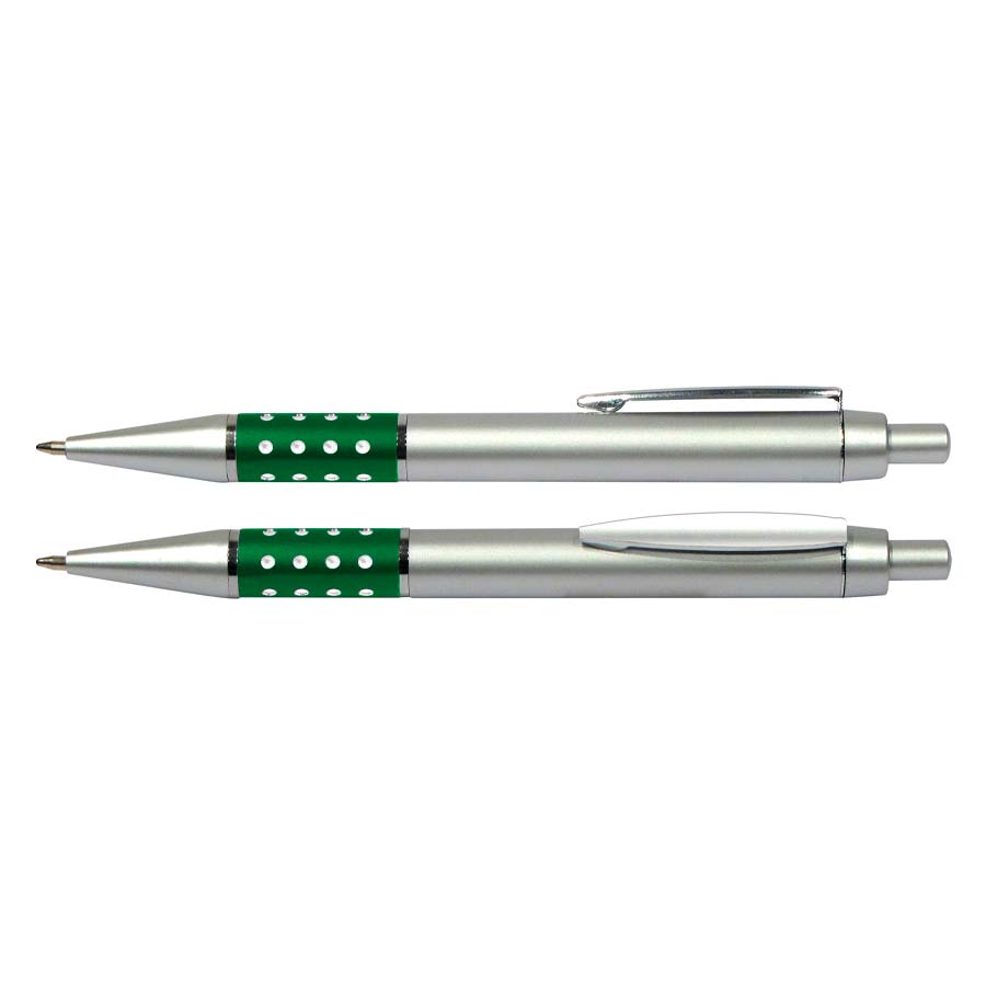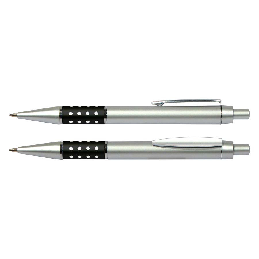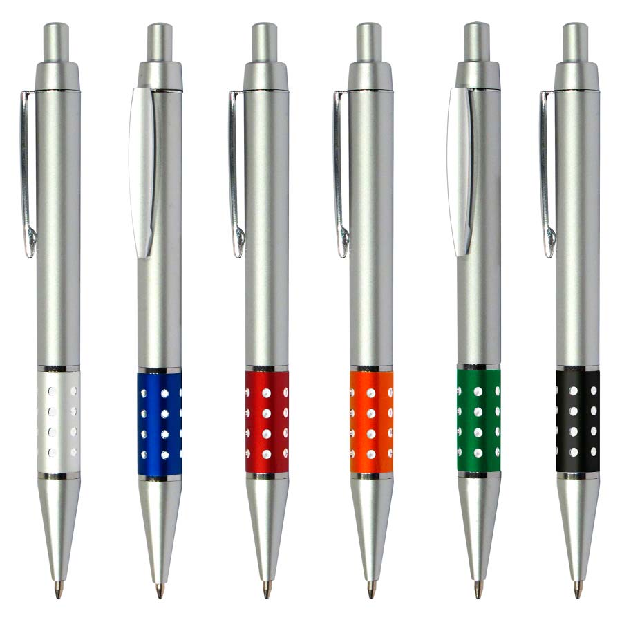 Bolígrafo Plástico Metalizado modelo “Alum”, con anillo metálico con orificios. Escritura azul.