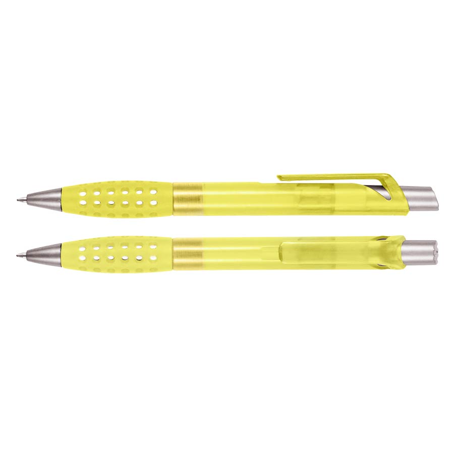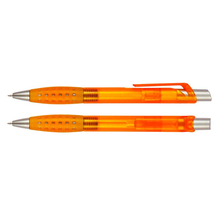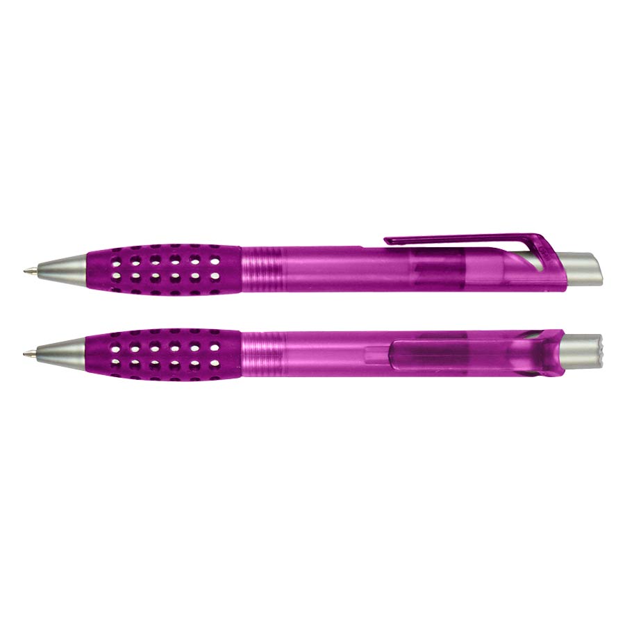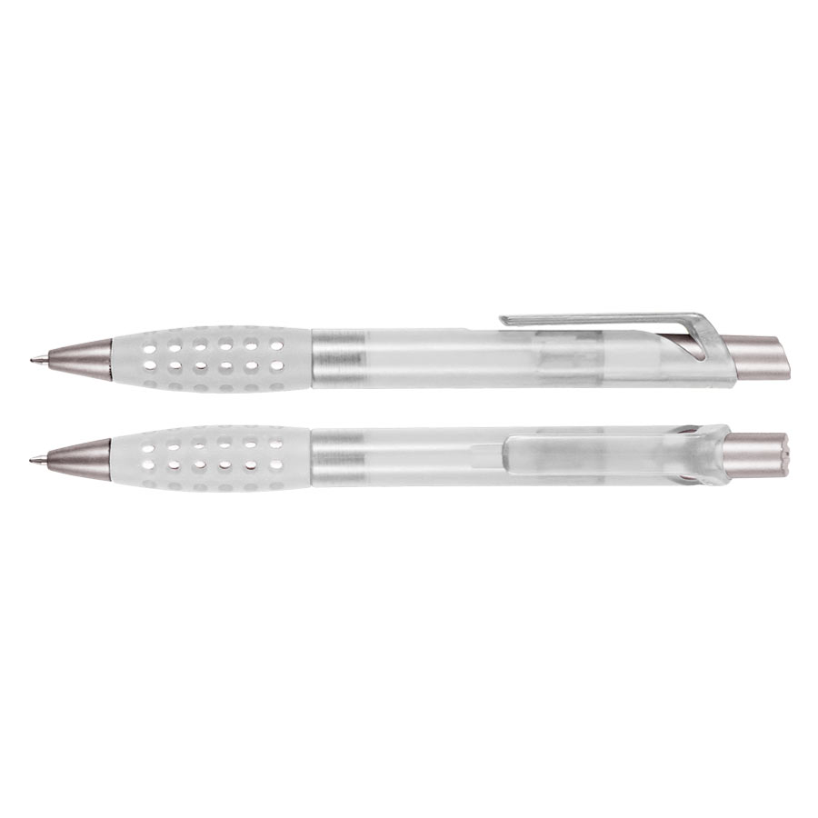 Bolígrafo plástico modelo “Punch” con grip de goma con orificios. Escritura azul.
