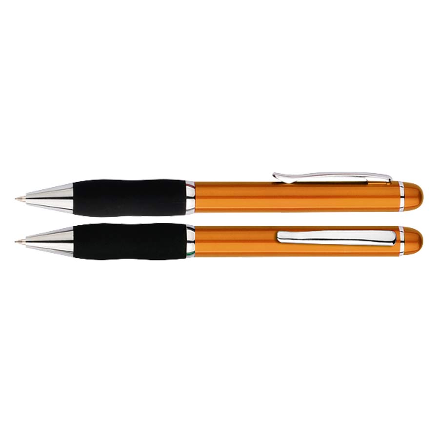 Bolígrafo plástico “Qasar” con cuerpo de color metalizado. Escritura azul.