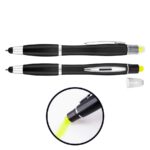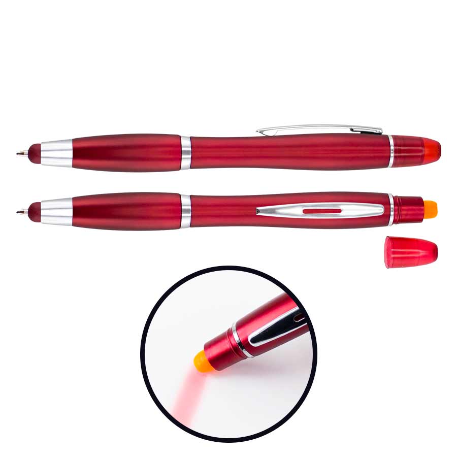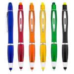 Bolígrafo plástico con cuerpo de color y puntero screen-touch al tono. Incluye práctico destacador (resaltador) de cera de color. Escritura azul.