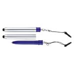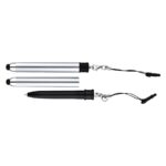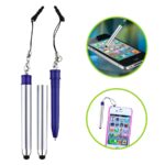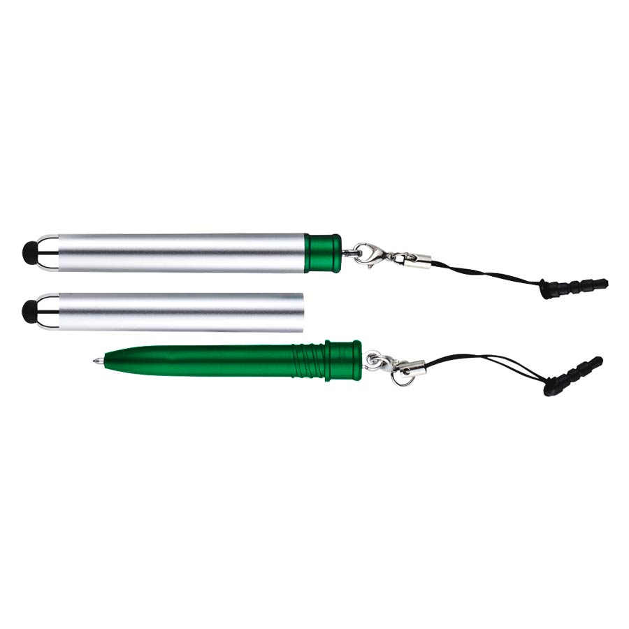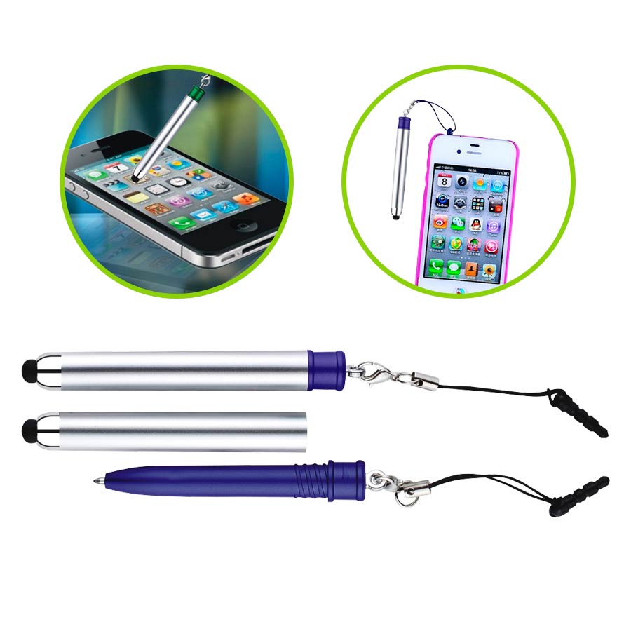 Bolígrafo “Touch-Screen” con tapa plateada y goma posterior negra para pantalla táctil. Incluye práctico soporte plástico para insertar en la salida de auricular del iPhone. Escritura azul.