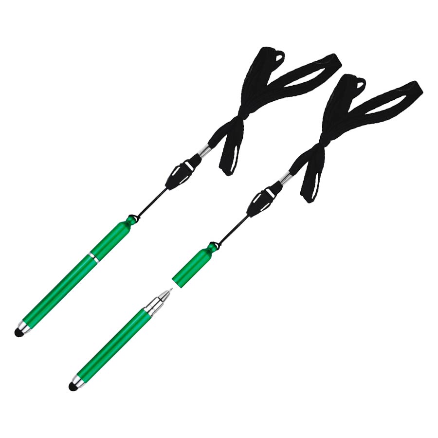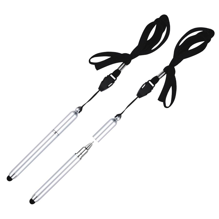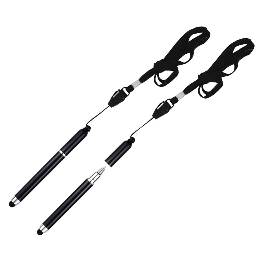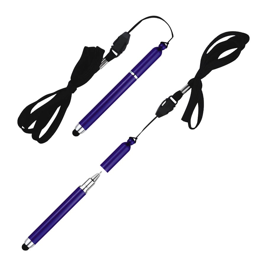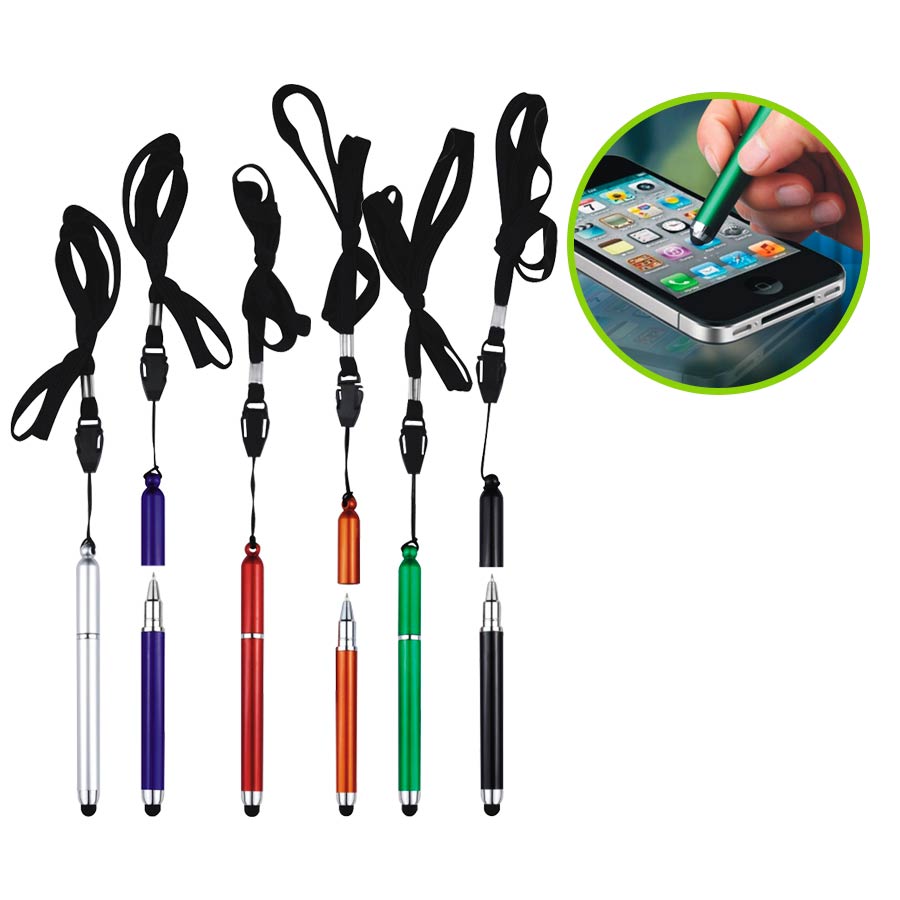 Bolígrafo “Touch-Screen” con goma posterior negra para pantalla táctil. Incluye lanyard colgante negro. Escritura azul.