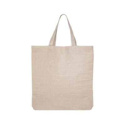 Medidas: 40 cm de alto, 38 cm de ancho y 20 cm de fuelle. Manillas: Cordón de yute de 65 cm de largo. Recubrimiento: Interior recubierto. Otros: Velcro de cierre, Bolsillo interior.