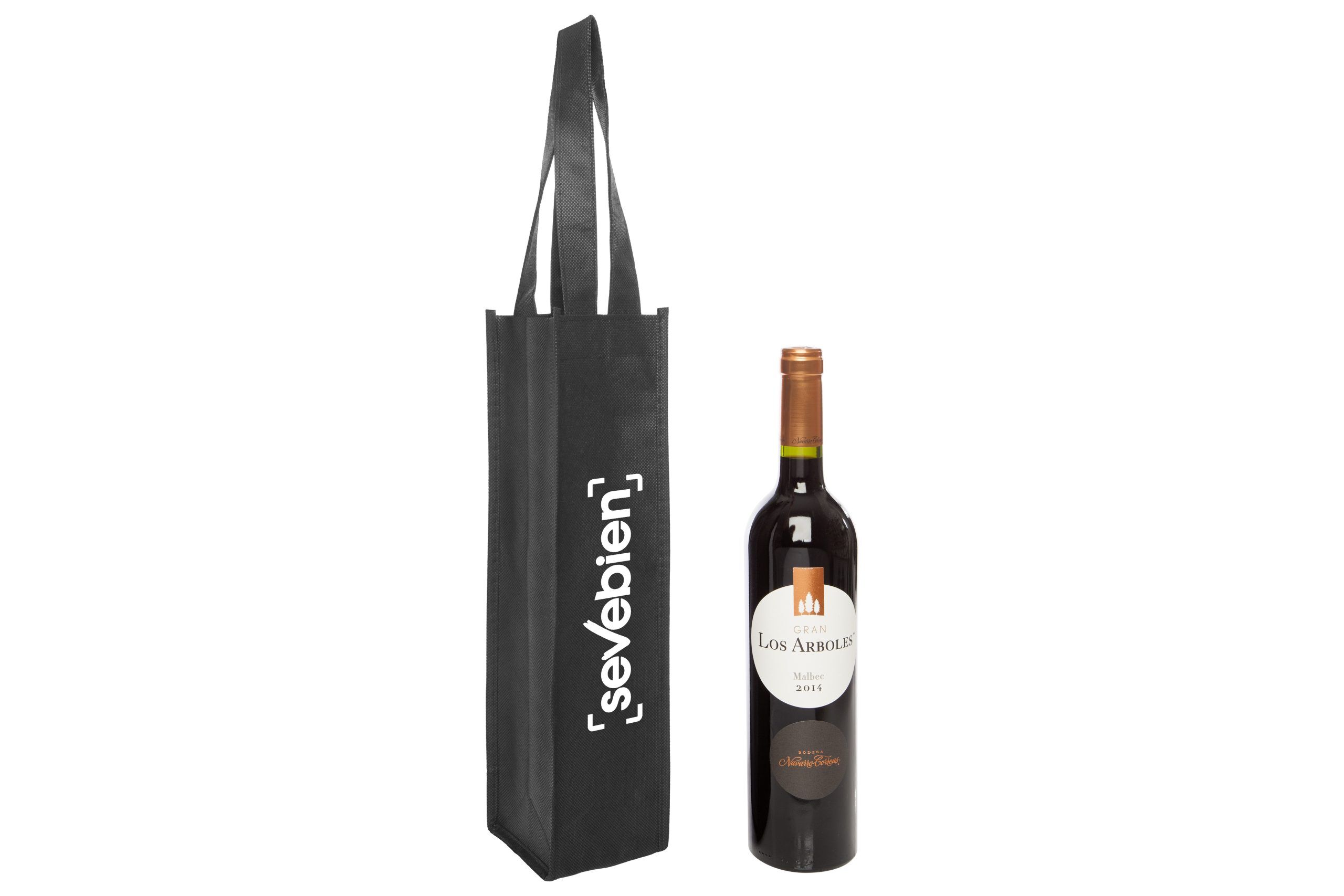 35 x 9 x 9 cm. Non-woven. Bolsa con manillas para una botella.