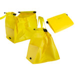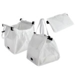 Bolsa reutilizable tela no tejida (TNT) reforzada de 100g/m2, modelo “Cart”. Cuenta con 2 asas de 40cm. c/u aprox. Contiene 2 soportes plásticos rígidos negros, para enganchar en las paredes laterales de los carros de supermercados tradicionales. Sistema de cierre pestaña con velcro, bolsillo lateral y frontales superiores elasticados para maximizar la superficie de apertura sobre el carro. 100% plegable para fácil transporte y guardado.