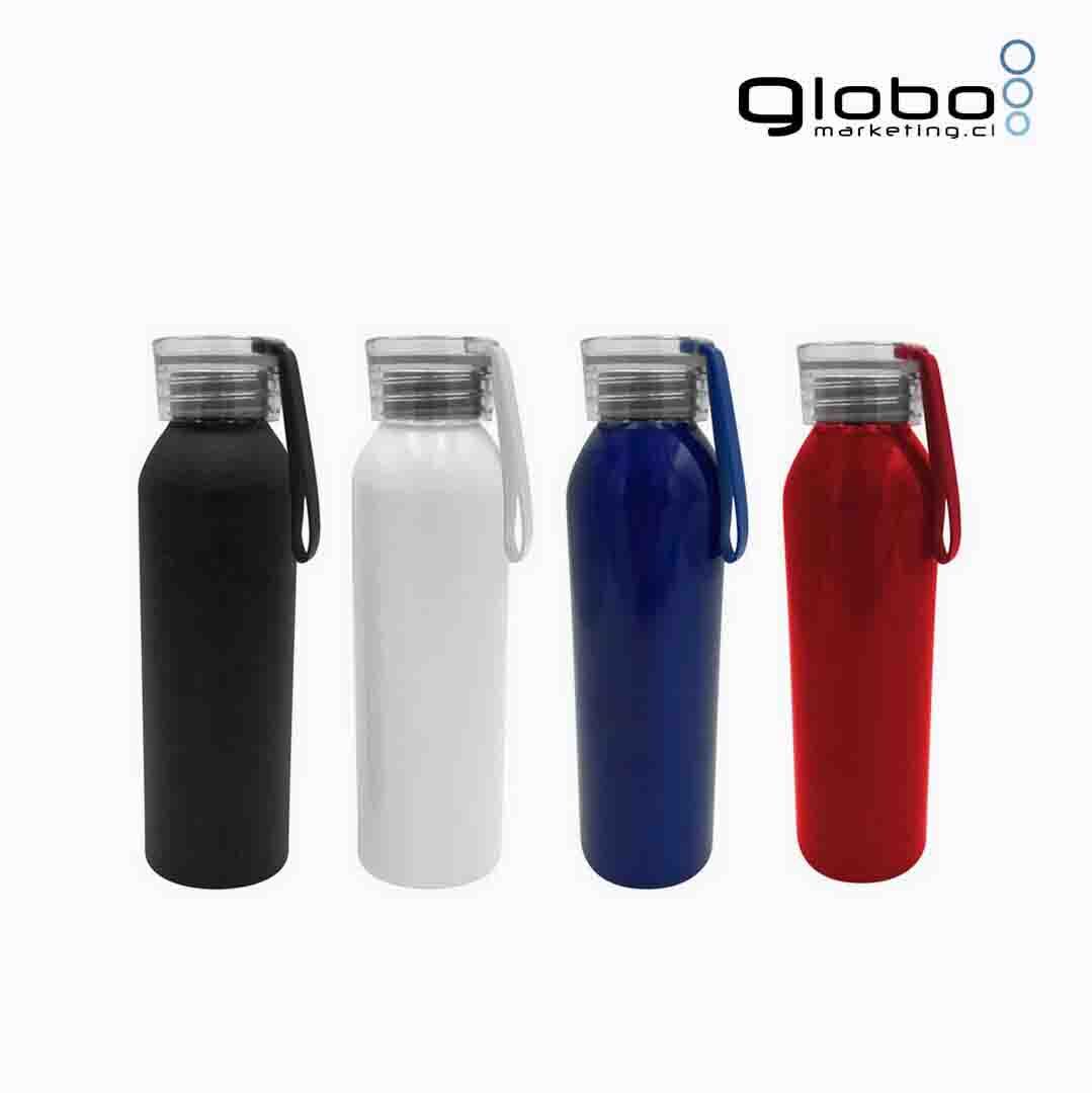 Ø 6,6 x 23,2 cm. Capacidad 600 ml. Aluminio. Botella de aluminio con cuerpo color. (blanco, negro, rojo y azul) Tapa transparente con tira de silicona (de 8 cm) del mismo color que el cuerpo de la botella (blanco, negro, rojo y azul). Cuerpo de botella recubierto con pintura especial para facilitar la impresión del producto. Presentado en caja de regalo.