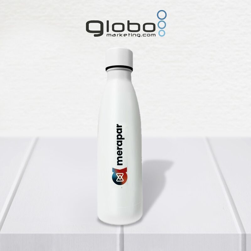 La Botella Atuel de acero inoxidable, con doble pared y libre de BPA, mantiene tus bebidas calientes por 4 horas y frías por 8 horas. Ideal para regalos corporativos.