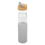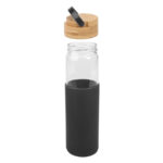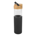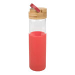 Botella de vidrio translúcido con funda de silicona de color, con tapa redonda twist-off de Bamboo y asa plástica. Producto BPA FREE, para el contacto con líquidos y alimentos. Capacidad 600ml. Presentación en bolsa plástico burbuja + caja de regalo de cartón kraft.