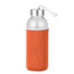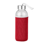 Botella cilíndrica de Vidrio Silica “Soda Lime”, un material duradero y resistente. Incluye tapa rosca de Acero inoxidable y cinta lanyard colgante de polipropileno (PP) color plata en su parte superior. Cuenta con una práctica funda removible de tela Neopreno aislante en colores, para una mayor protección contra golpes y temperatura . Producto BPA FREE, para el contacto con todo tipo de líquidos. Capacidad 440ml. Apta para Lavavajillas (sin funda).