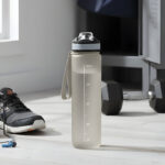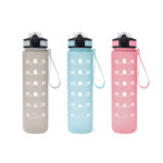Botella deportiva motivacional. Botella de color pastel con acabado frost. Tapa plástica combinada en color negro con el de la botella. Apertura rápida, boquilla transparente rebatible y popote incluído. Correa del mismo color de la botella.