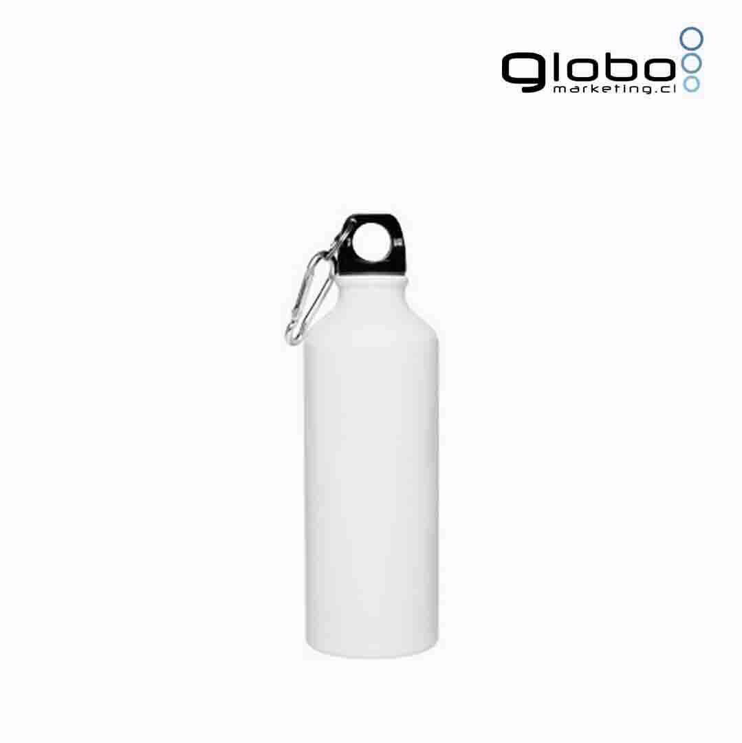 Botella blanca de Aluminio de 500cc. con cobertura para Sublimación. Incluye tapa rosca plástica y mosquetón metálico plateado.