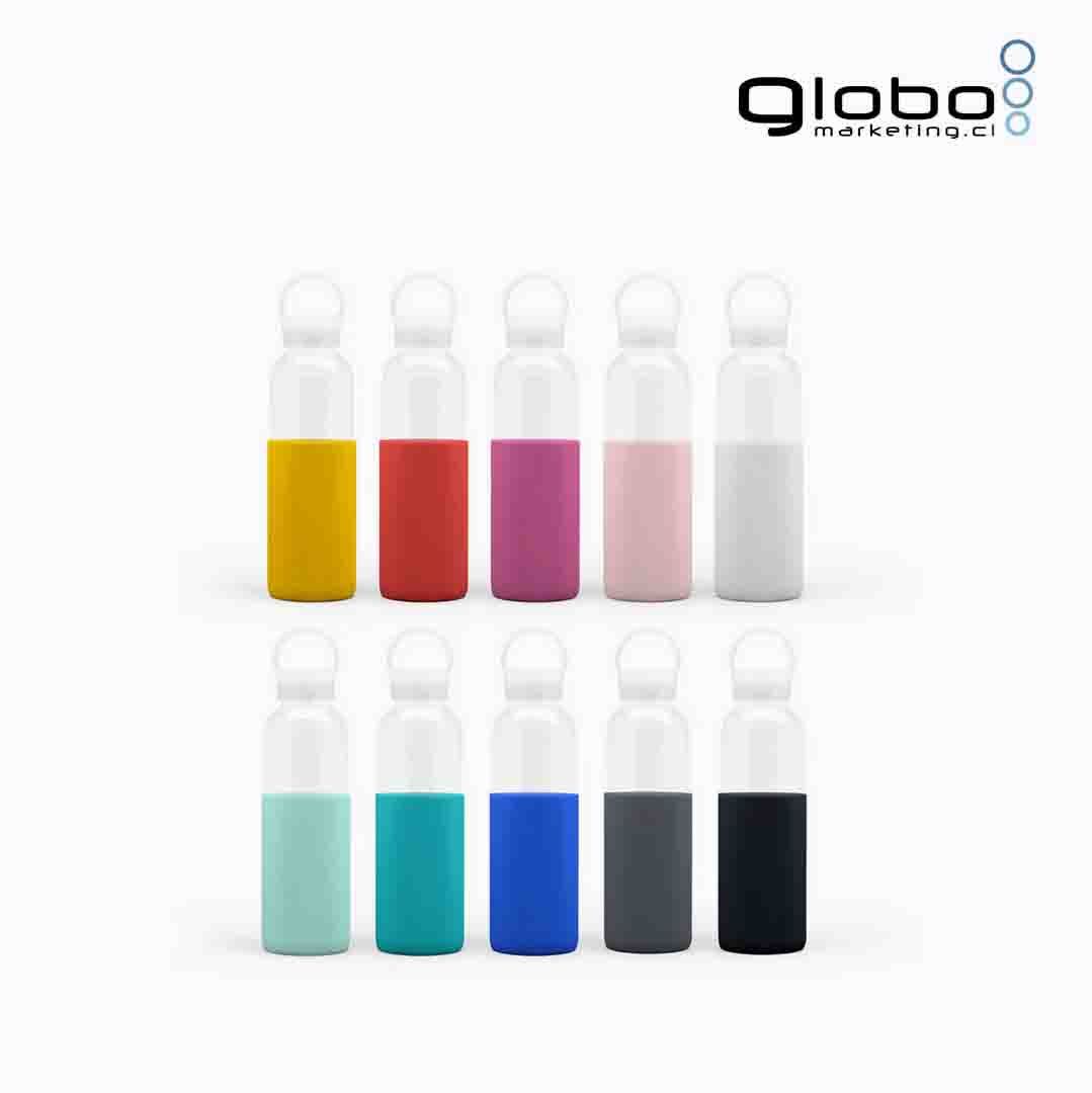 Botella de 450ml práctica y reutilizable ya que es de vidrio de borosilicato. Posee manga de silicona antideslizante en varios colores y pico ancho. Su tapa es a rosca, antiderrame y con manija de agarre. Vidrio de borosilicato. Ø 6,5 x 24 cm. Es un producto BPA free, apto lavavajillas.