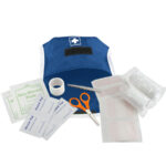 1 Tijera, 1 Pinza, 1 Rollo de Gasa elasticada de 3 x 7 cm, 1 Rollo de Gasa elasticada de 3 x 5 cm, 4 Toallas Húmedas con alcohol gel, 1 Cinta Adhesiva, 2 Parches Curitas de 6 x 5 cm, 2 Parches de Gasa estériles de 5 x 5 cm, 4 Parches Curitas bordes redondeados de 7 x 2 cm.
