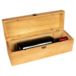 Caja de Madera natural de Teca, para botella de vino. Con broche color bronce envejecido.