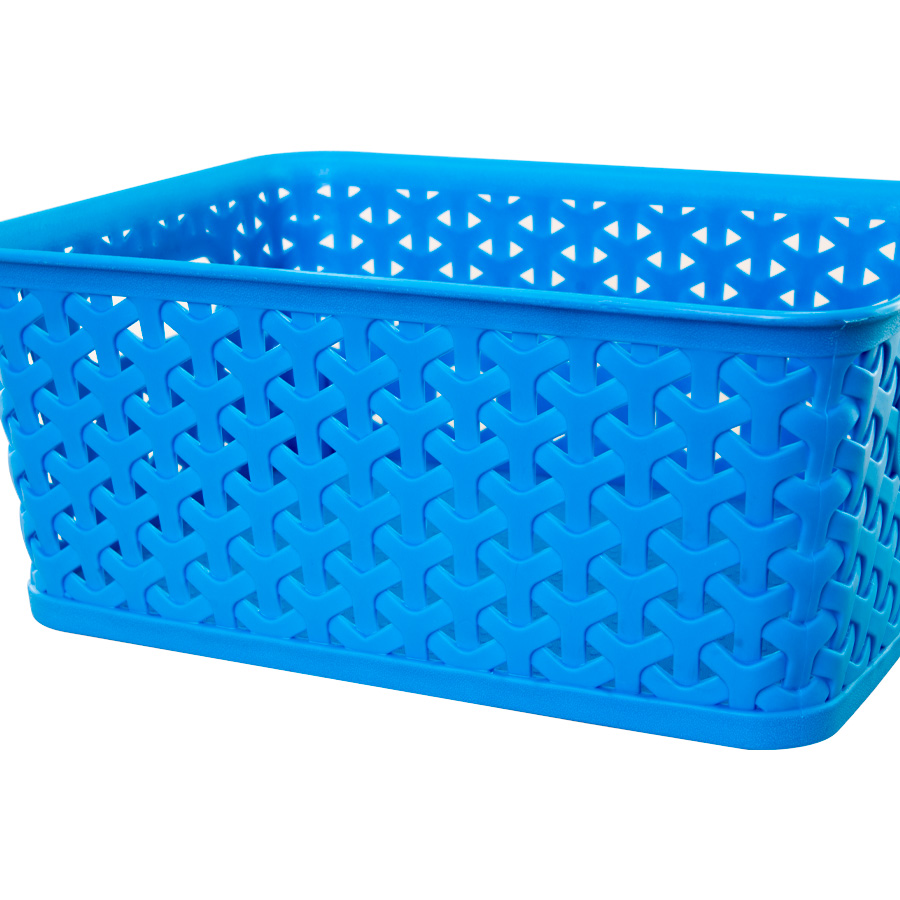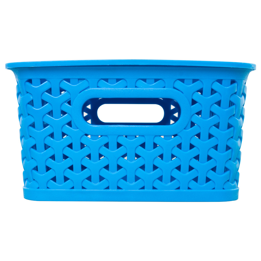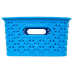 Canasto plástico organizador de 25.5 x 20 x 10.5 cm con tapa plástica. Diseño entrelazado tipo ratán. Capacidad 5 lt. Ideal para guardar objetos pequeños.