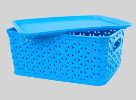 Canasto plástico organizador de 25.5 x 20 x 10.5 cm con tapa plástica. Diseño entrelazado tipo ratán. Capacidad 5 lt. Ideal para guardar objetos pequeños.