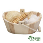 Canasto SPA de belleza en madera modelo “Naturals”. Contiene cepillo de pelo, esponja malla, masajeador de madera, piedra pomez y esponja de masaje corporal.