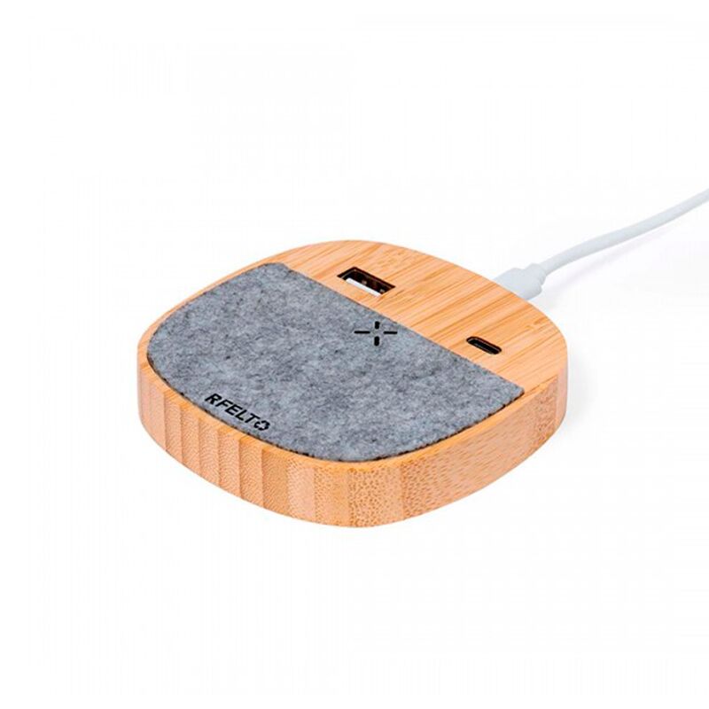 Cargador inalámbrico fabricado en bambú y fieltro RPET. Función de carga de 15W y compatible con dispositivos equipados con tecnología Qi. Incluye 2 salidas para multicarga de dispositivos: 1 salida tipo USB y una salida Tipo C.