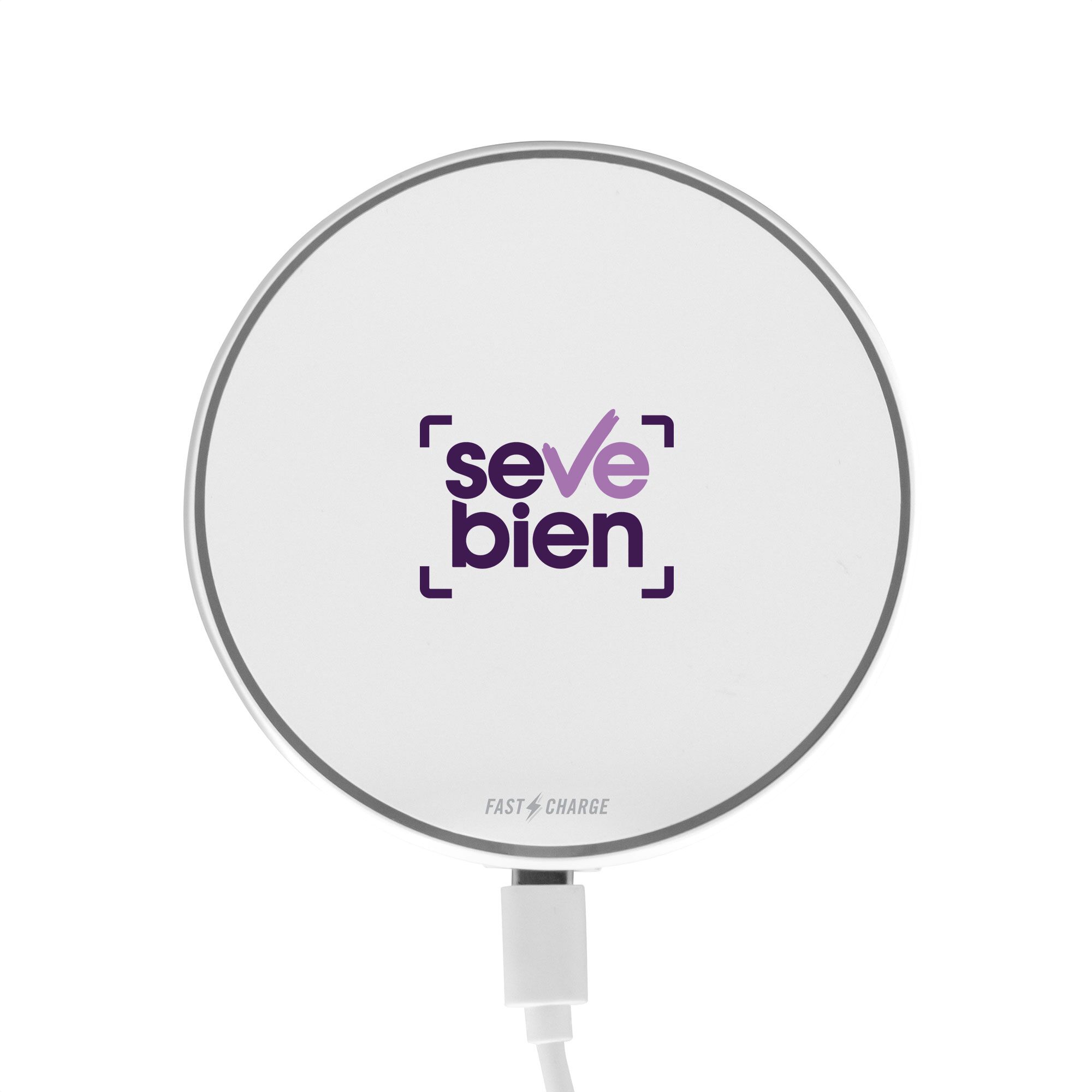 Mantente siempre conectadoCargador inalámbrico con luz. Base plástica color blanco con antideslizantes. CARGA RÁPIDA. Salida: 15 watts. Luces indicadoras de carga. Cable de carga USB-C en color blanco de 50 cm de largo. Compatible exclusivamente con celulares que permitan carga inalámbrica (tecnología qi). Medidas: Ø 9,7 x 0,9 cm.
