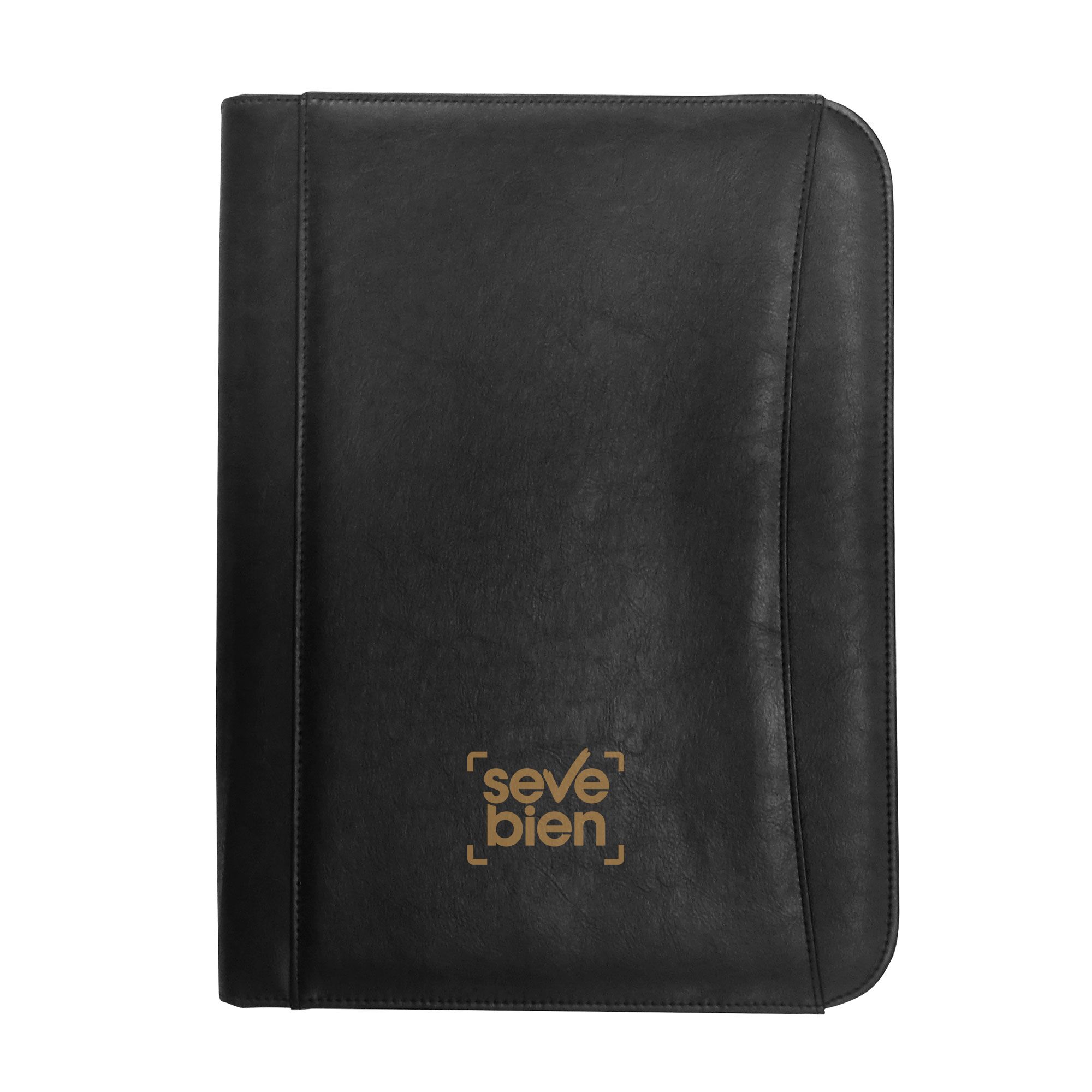 26 x 35 x 3 cm. Poliuretano. Carpeta con cierre. Contiene 1 bloc de 20 hojas lisas tamaño A4. Porta bolígrafo. Bolsillo externo. Compartimentos internos para 7 tarjetas. Sobre con fuelle y bolsillo interno con cierre. Diseñada con materiales que poseen algunos beneficios ambientales sobre el cuero genuino, ya que no requiere de animales para su fabricación y además, no necesita ser químicamente curtido.