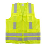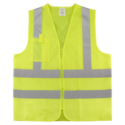 Chaleco Reflectante de Seguridad modelo “Supervisor”, 100% tela poliéster 120 g/m2 fluorescente con bandas reflectantes color plateado de 5 cm. de ancho. Incluye 4 bolsillos y cierre-eclair. Cumple con norma legal vigente EN 471.