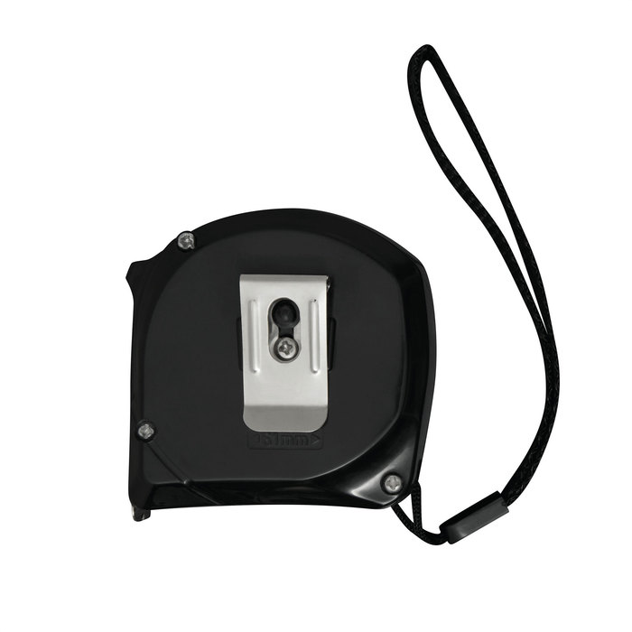 Cinta métrica. 3 metros de longitud. Cinta de acero inoxidable con traba de seguridad y clip sujetador metálico. Estructura de ABS con detalle circular en bambú. Correa de poliéster.