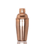 Coctelera de Acero inoxidable 304 SS de 0.8mm de espesor, con superficie lisa encobrizada. Producto BPA FREE, para el contacto con líquidos y alimentos. Capacidad 500ml. Presentación en plástico burbuja + caja de regalo de cartón negro.