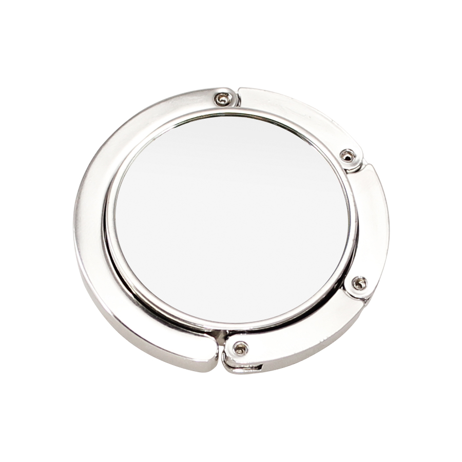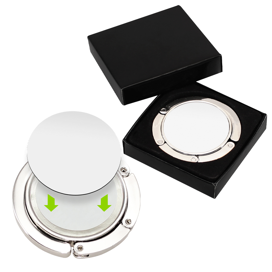Colgador Metálico redondo de sobremesa, para Bolsos y Carteras, con círculo central para Sublimación. Presentación en estuche laminado negro con cuna aterciopelada.
