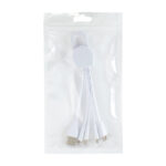 Connect Multicargador 5-en-1 con cables plásticos TPE engomado blanco y base plástica ABS blanco con mosquetón. Multi-cables con terminales de carga USB / Micro USB / Mini USB / Lightning / Type C. Compatible con dispositivos Android, Apple y Type C. Presentación en elegante bolsa OPP con orificio para colgador de ganchera. Producto con aprobación CE, ROHS, FC.