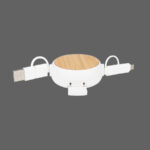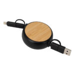 Connect Multicargador plástico ABS retráctil 4 en 1, con cubierta redonda de madera de bamboo. incluye 2 cables de plástico engomado TPE de color de 40cm c/u, con conector USB tipo (Micro-USB / Lightning / Type C) y conector de carga (USB / Type C). Presentación en bolsa 100% compostable + caja de regalo en cartón color natural.