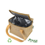 Bolso cooler con exterior de Yute e interior térmico aislante de PEVA y acolchado con esponja PE FOAM. En la tapa, sección superior del cooler, viene con una ventana cosida de eco-cuero, para aplicar logo de manera más elegante.
