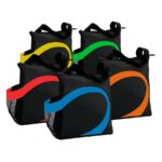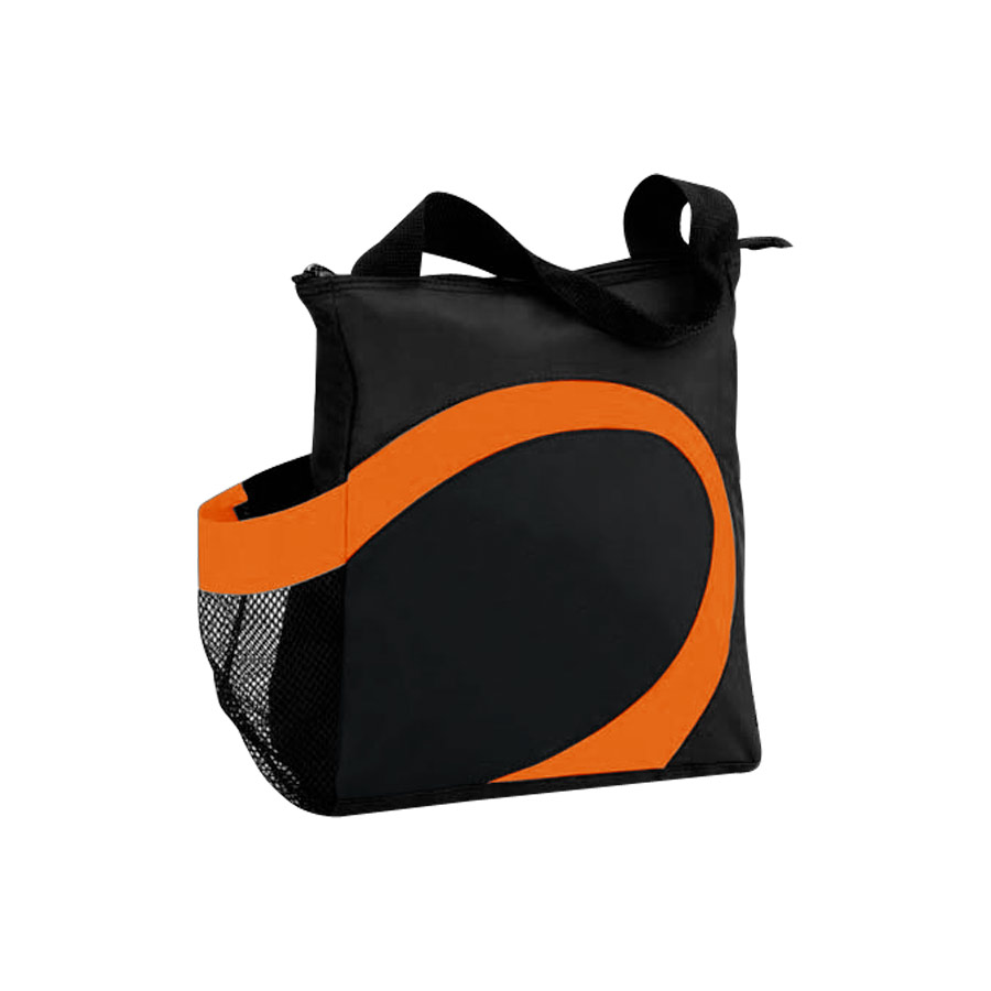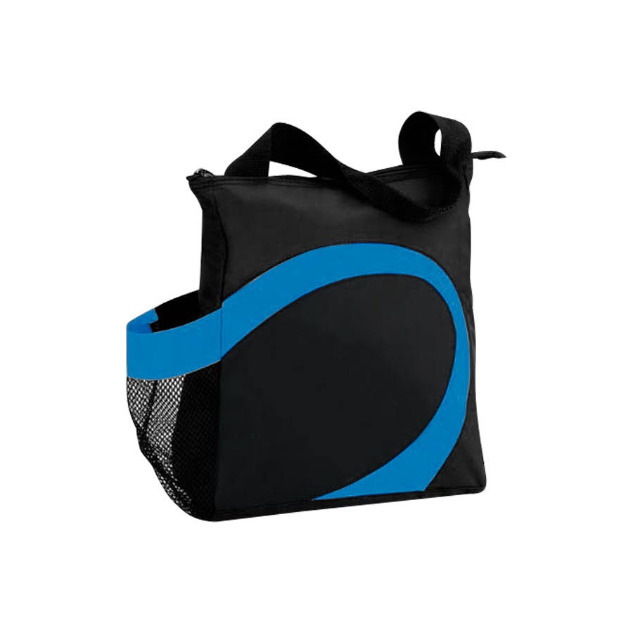Cooler modelo “Wave”. Tela exterior Polyester 70D/PVC. Tela interior plateada aislante 15C PEVA + relleno 3mm esponja PE. Cierre cremallera superior. Incluye bolsillo lateral en tela malla.