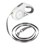 Correa extensible de 3mts para mascota, en plástico ABS blanco con detalles grises y correa de nylon color gris con sistema de traba. Contiene una linterna LED luz blanca + juego de luces LED de colores en círculo central. Usa 2 pilas AAA (no incluídas). Presentación en caja de cartón blanco de regalo.