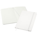 Cuaderno modelo “Colorskine” tamaño A5, con cubierta de cartón piedra forrada en PU simil cuero de color de 1.5mm de espesor. Interior 80 hojas lineadas amarillas de 80gsm. Incluye banda elástica y huincha separador de hojas al tono. Presentación individual en bolsa de polipropileno.