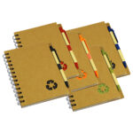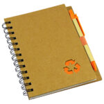Cuaderno Ecológico con Tapas Duras de Cartón Reciclado 650gsm, 70 hojas interiores lineadas y anillado metalico doble cero. Incluye Bolígrafo Ecológico y logo “Reciclable” troquelado en la tapa.