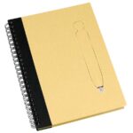 Cuaderno Ecológico con Tapas Duras de Color, en Cartón Reciclado 650gsm, 70 hojas interiores cuadriculadas y anillado metalico doble cero. Incluye Bolígrafo Ecológico de cartón troquelado, incrustado en la tapa.