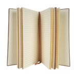 Cuaderno tamaño A5, con cubierta de PU eco-cuero de 2mm de espesor y lomo pintado de color al tono. Interior 80 hojas lineadas amarillas de 80gsm. Incluye banda separador de hojas al tono. Presentación individual en bolsa de polipropileno.
